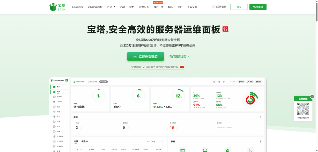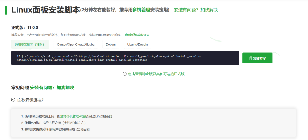 进入 宝塔官网 页面获取安装脚本,点击立即免费安装