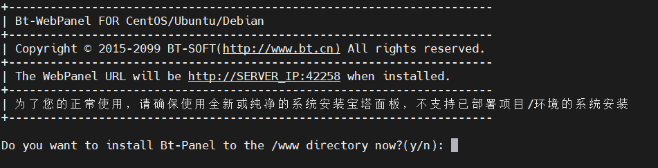复制命令后回到 SSH 终端直接粘贴后回车,接着会看到是否安装到 /WWW 目录,输入 y 后回车等待即可