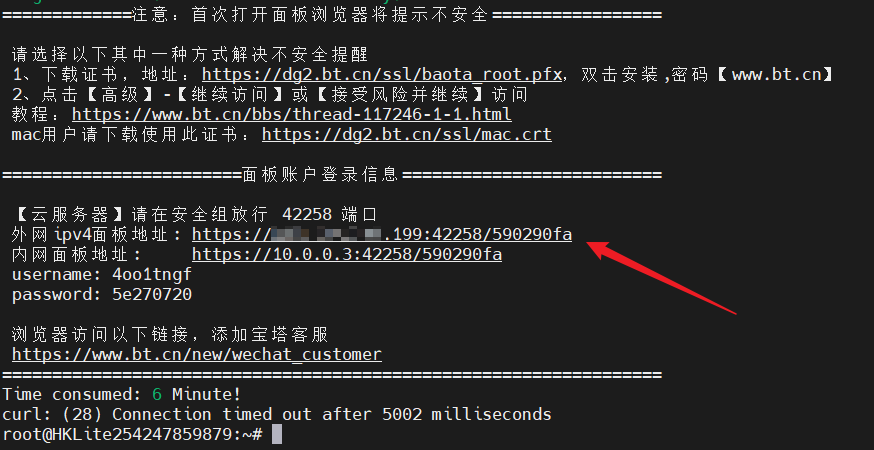 等待数分钟后看到此界面便是安装完成,使用外网访问地址打开宝塔面板